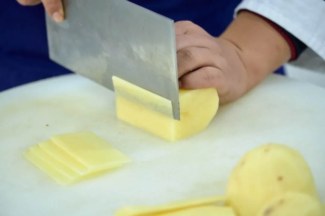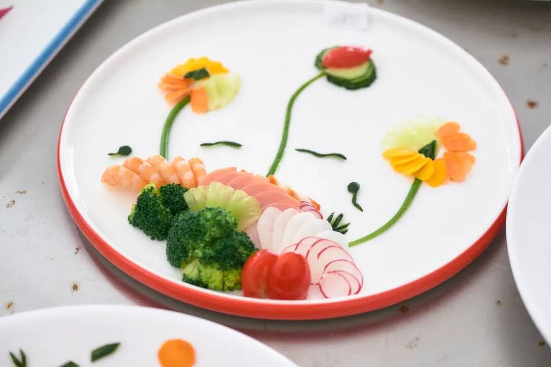 中式烹调比赛现场,有展现刀工的切土豆丝,也有展示创意的五彩拼盘,还有展示制汤调味的酸辣肚丝汤。