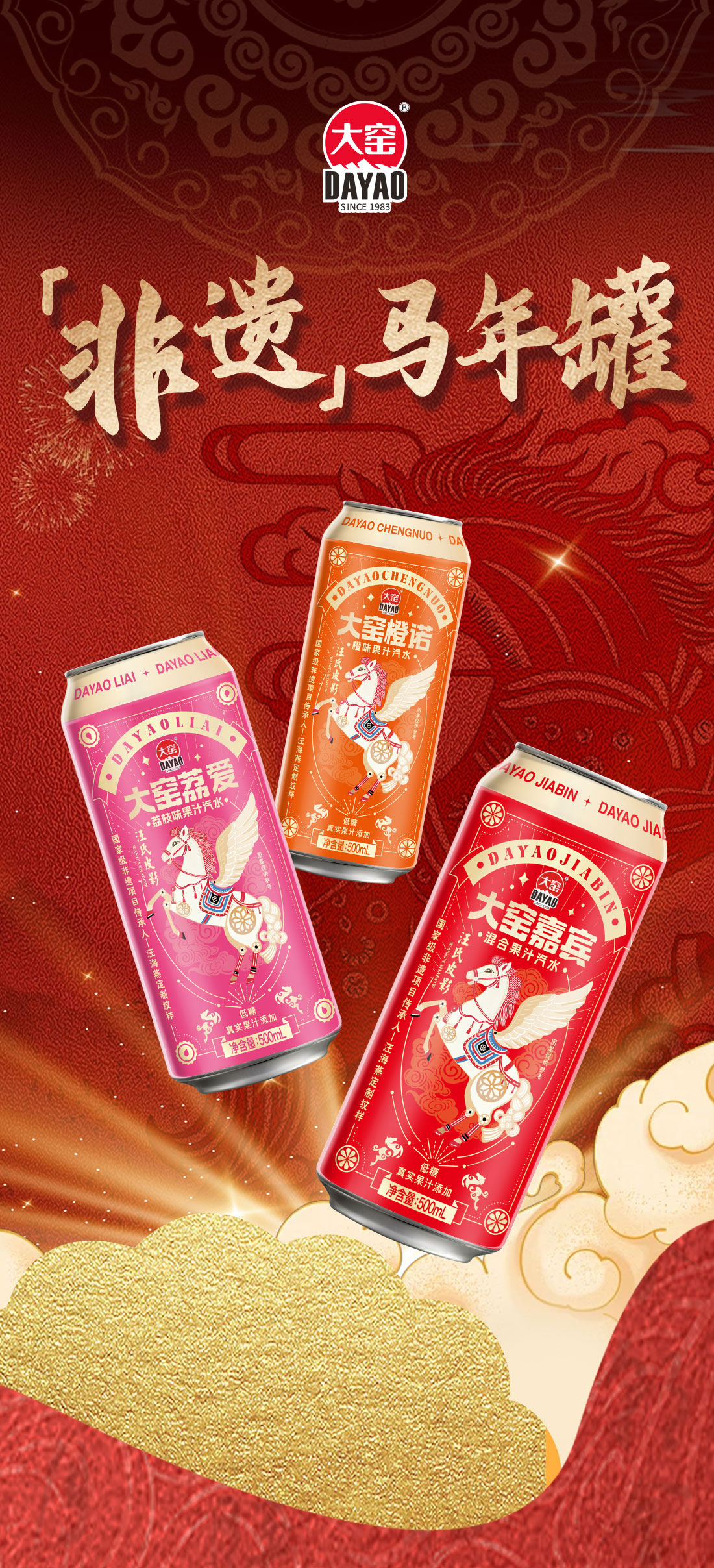 此次,大窑特邀“汪氏皮影”传承人亲自操刀,推出马年新春限定包装,精准聚焦春节场景,将非遗文化与年俗进行了深度绑定,将皮影艺术从荧幕“搬”上了餐桌。这款非遗联名罐包含大窑嘉宾、大窑橙诺、大窑荔爱三款经典果汁汽水,真实果汁添加,喝一口气感十足。在保留产品“劲爽大汽”核心特点的基础上,遵循“纹必有意,意必吉祥”的传统纹样逻辑,将汪氏皮影的标志性技艺与吉祥寓意深度融入产品包装,设计细节处处体现匠心。