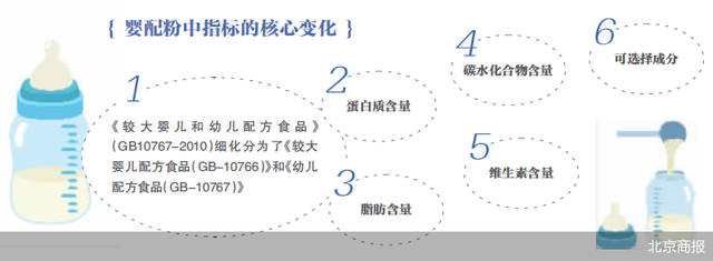 新国标最大的改变是将《较大婴儿和幼儿配方食品》(GB10767-2010)细化分为了《较大婴儿配方食品(GB-10766)》和《幼儿配方食品(GB-10767)》,在蛋白质、碳水化合物、微量元素以及可选择成分等部分作出了更明确严格的规定。